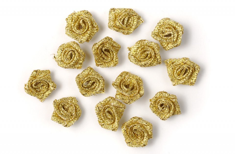 Drobné zlaté tkaninové růžičky jsou dokonalým doplňkem ke zdobení všech druhů kreativních projektů jako jsou alba či pohlednice. Ideální k vytváření vlastnoručních dekorací, oděvních a interiérových dekorací stejně jako ke zdobení krabic, obalů, dárků a mnoho dalších. Velikost: 1,5cm. Množství: 20ks.