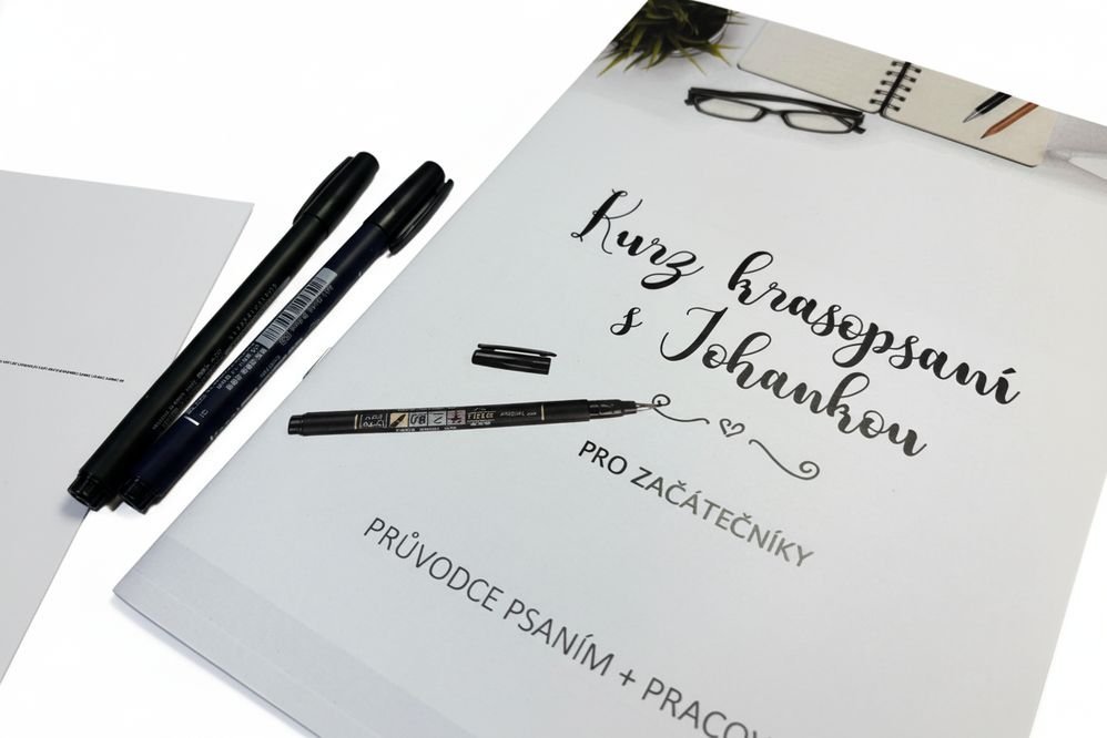 - 2 ks malé štětcové fixy Tombow: Jeden měkčí a druhý tvrdší, ideální pro různé styly a techniky moderní kaligrafie.