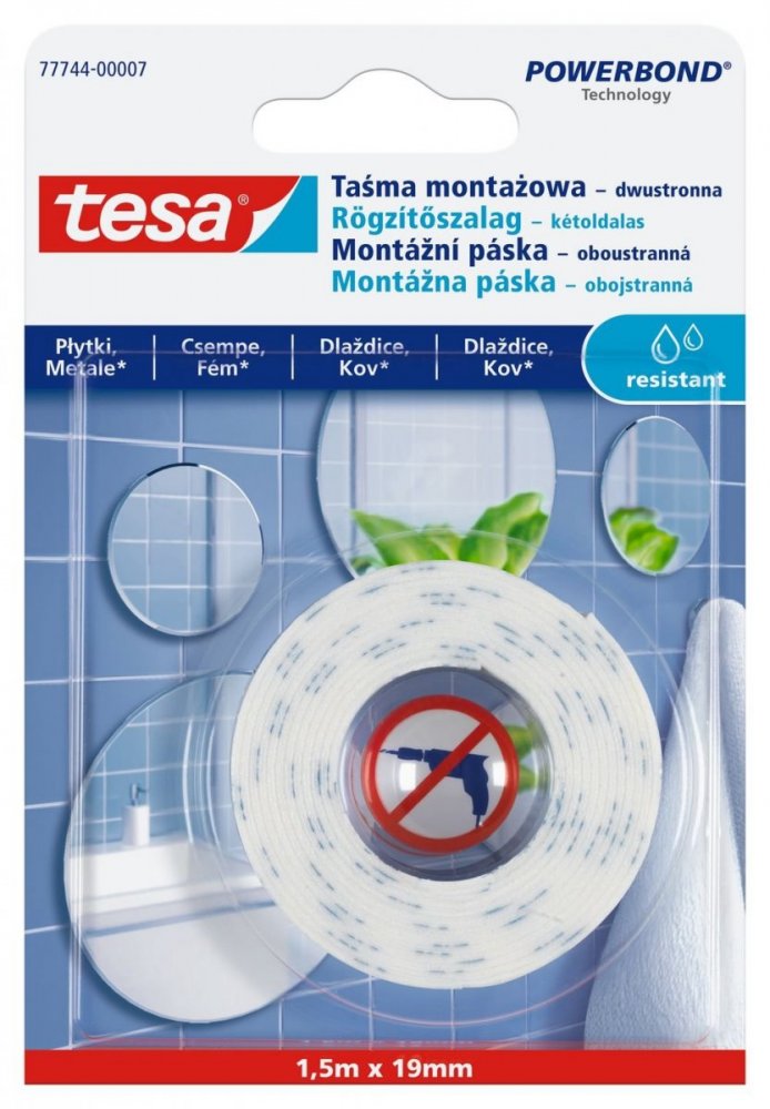 Montážní páska na dlaždice a kov tesa® byla navržena speciálně na bleskurychlou montáž předmětů na hladké a pevné povrchy, a to i ve vlhkém prostředí. Vyrovnává drobné nerovnosti podkladu a perfektně se hodí na povrchy a situace, kde vrtání nepřichází v úvahu.