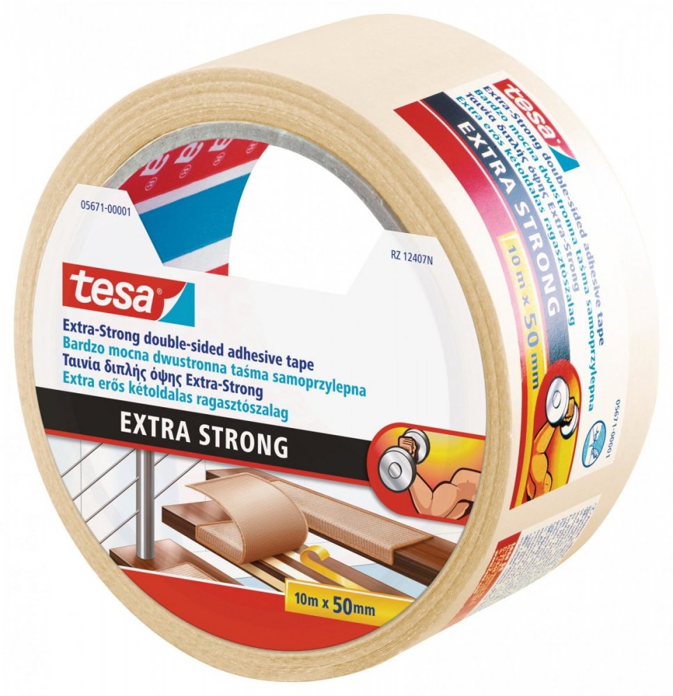 Oboustranná podlahová páska tesa® s extra silnou přilnavostí je extrémně odolná, určena výhradně pro zátěžové podlahové krytiny a kryté venkovní objekty.