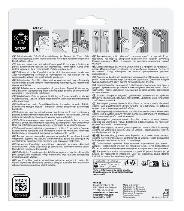 Samolepicí gumové těsnění tesa® IZOLAČNÍ je ideálním řešením pro netěsnící okna a dveře. Chrání před chladem, teplem, hlukem a vlhkostí, čímž zajišťuje pohodlné prostředí. Snadno se přilepí - stačí vám pouze nůžky. Po důkladném očištění povrchu od nečistot, mastnoty a prachu můžete začít s instalací. Profil těsnění, který připomíná písmeno E v průřezu, spolehlivě utěsní malé mezery o šířce 1 - 3,5 mm mezi rámy oken a okenními křídly. Je vhodné pro většinu typů oken, dveří do místností nebo skříňových dveří. Samolepicí gumové těsnění tesa® IZOLAČNÍ je odolné vůči UV záření a teplotám, lze jej snadno odstranit - bez zanechání jakýchkoliv zbytků.