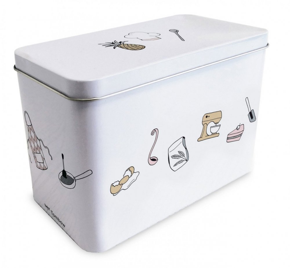 - Kovová krabička (šířka x výška x hloubka: 162 x 112 x 112 mm) s hravým, minimalistickým designem pro uchovávání kartiček formátu A6 s recepty a psacích potřeb obsažených v sadě. Krabička je kompaktní a najde si díky tomu místo i v malých kuchyních. Dostupná pouze v rámci této sady.